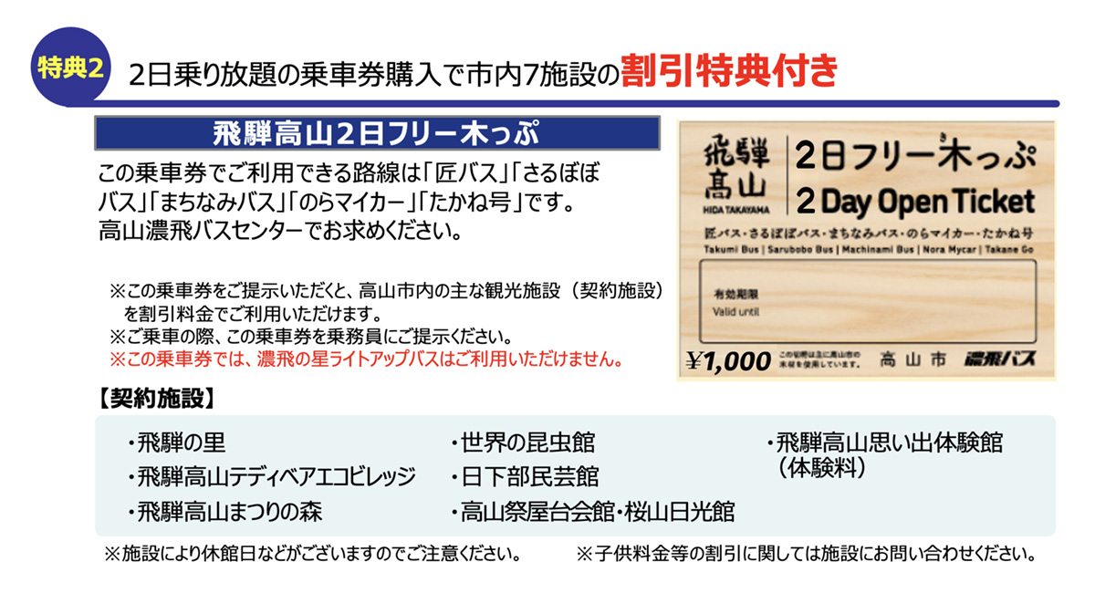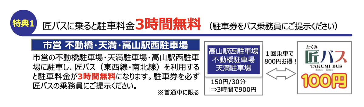 「不動橋駐車場」・「天満駐車場」・「高山駅西駐車場」に駐車し、匠バスをご利用いただいた際は、